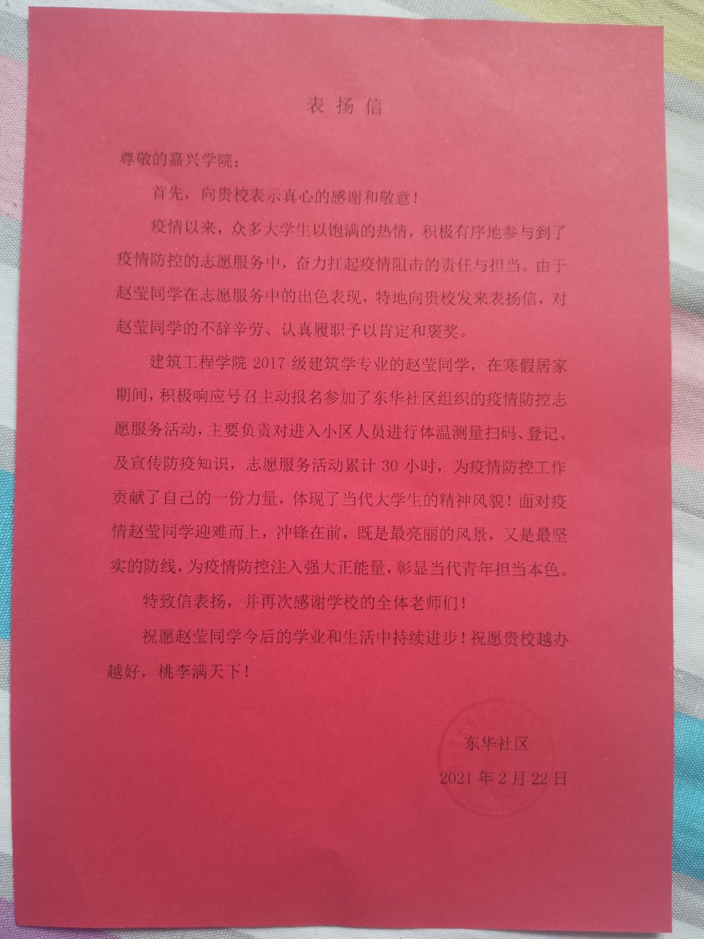 建筑172赵莹同学、工管181许涵茜同学、建筑192张峰源及高磊同学、建环201汪济磊同学、建筑202任学渊同学积极主动加入疫情防控志愿服务队伍、为当地疫情防控工作无私奉献提出了感谢和表扬,并对黄色网
