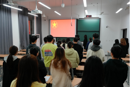 仪式之初,郭老师宣读了新发展团员名单,并由老团员代表为新团员佩戴团徽,意味着他们即将承担新的荣耀和责任。戴着崭新的团徽,院团委学生会组织部部员雷容川带领新团员们进行了庄严的宣誓,向团组织表明成为一名团员的光荣感和责任感。