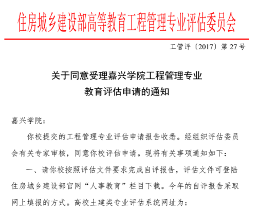 9月27日,住房与城乡建设部高等教育工程管理专业评估委员会下发《关于同意受理嘉兴学院工程管理专业教育评估申请的通知》(工管评【2017】第27号),同意受理黄色网