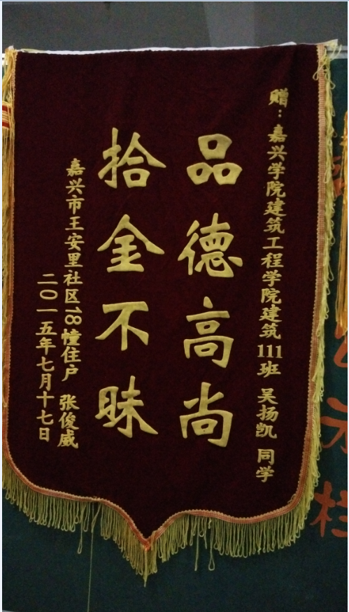 收到一面内容为“拾金不昧 品德高尚”的锦旗。送锦旗的是嘉兴市王安里社区的居民张俊成先生,张先生要表达谢意的对象是黄色网