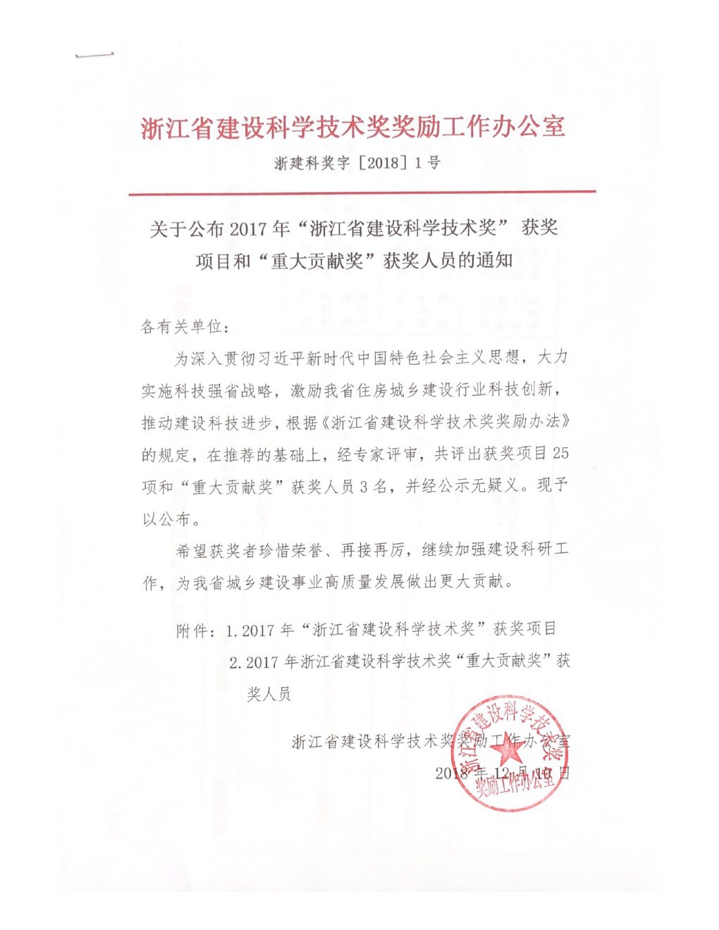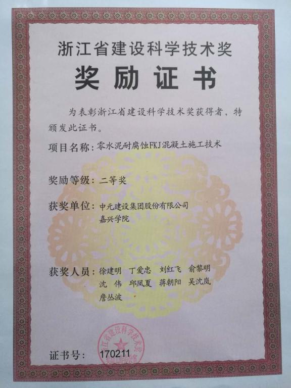 2017年度“浙江省建设科学技术奖”于2018年12月14日正式发布,共评出一等奖3个,二等奖11个,三等奖11个。中元建设集团股份有限公司和嘉兴学院共同完成的《零水泥耐腐蚀FKJ混凝土施工技术》项目获得二等奖。嘉兴学院黄色网