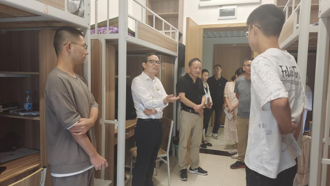 在走访过程中,周校长向新生们表达了学校的问候和关怀,并与新生们亲切交谈,仔细询问新生在学校衣、食、住、行各方面的问题,认真聆听学生对学校环境、迎新工作的感受,详细了解每位新生的基本情况和入学心情。同时周校长希望新生们尽快适应并融入到大学集体生活中。