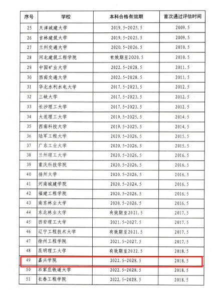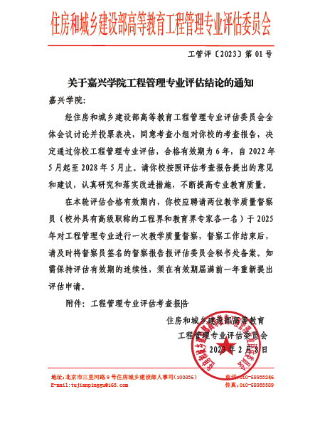 2023年2月8日,住房城乡建设部高等教育工程管理专业评估委员会公布了《关于嘉兴学院工程管理专业评估结论的通知》(工管评〔2023〕第01号),黄色网 工程管理专业自2018年6月首次通过住建部组织的专业评估(认证)后再次通过了专业评估(认证),合格有效期为6年。通过专业评估(认证)意味着黄色网 工程管理专业的人才培养质量得到了行业的认可,对黄色网 工程管理专业人才培养与国际接轨、提升教育质量和专业影响力具有重要意义。