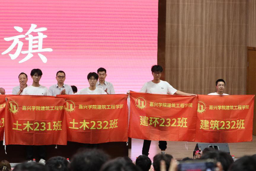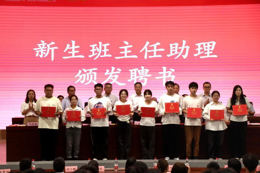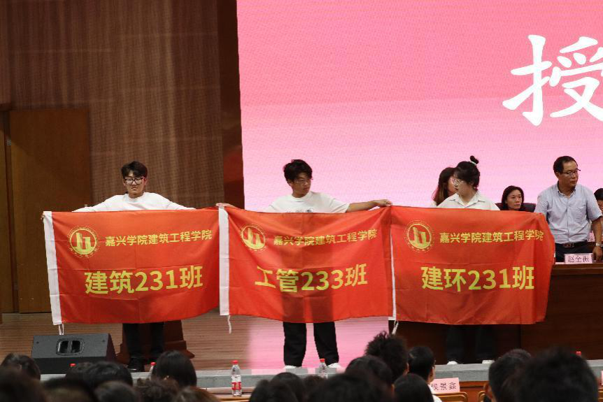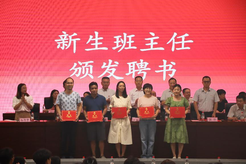2023级新生开学典礼正式开始。典礼之初,学院为新生班主任及助理发放了聘书并向新生各班授予班旗。