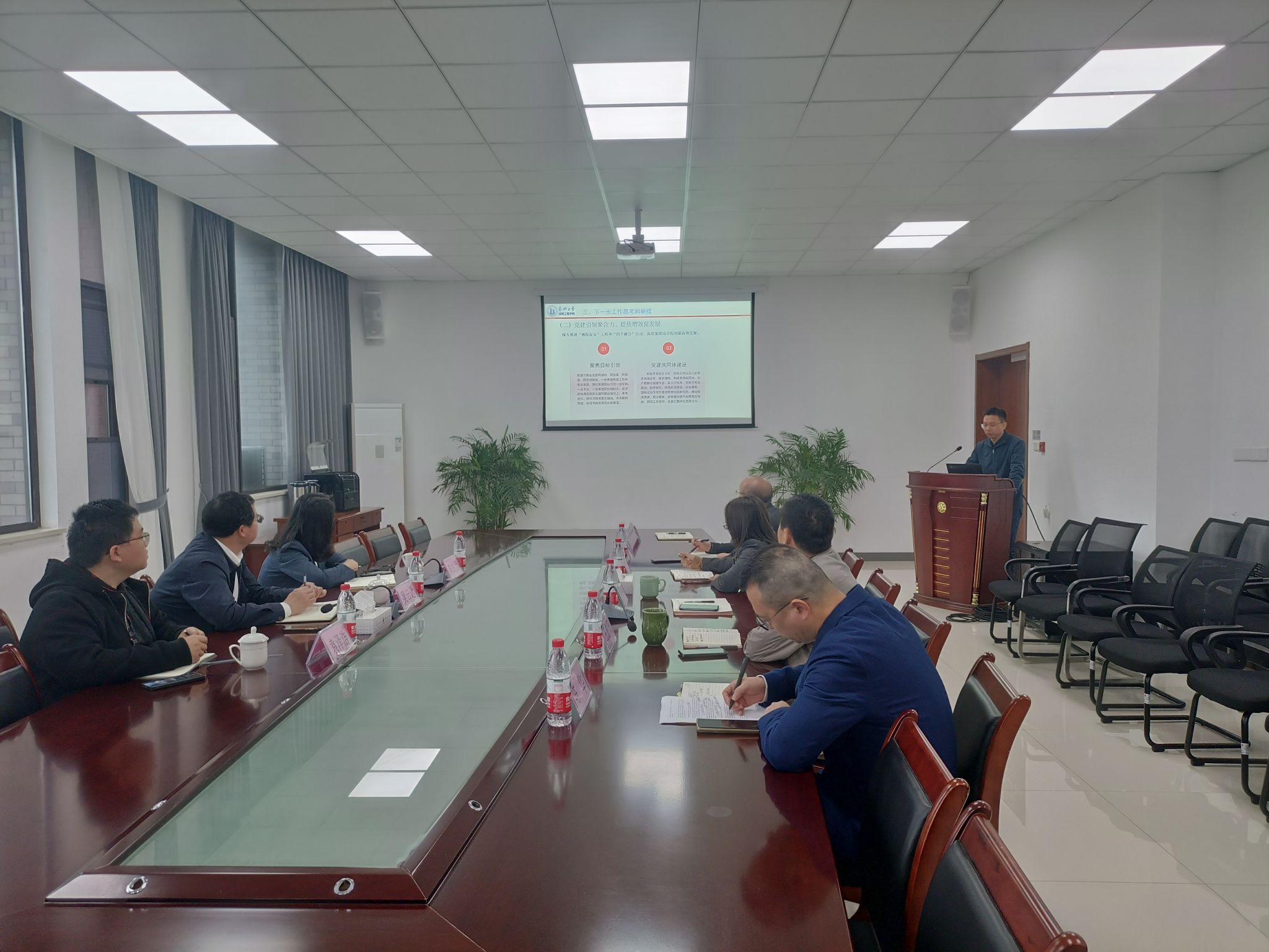 学院党委书记童勇军作主题为“党建引领‘四个融合’,推进学院高质量发展”的汇报。他介绍了新班子到任后开展的工作情况,分析了学院发展形势及存在的问题,并详细阐述了下一步的工作思路和举措。童勇军提到,通过走访、调研和与教授们的深入交流,深入了解了学院各部门的工作动态和发展情况,明确了提质增效的工作要求。同时,新班子展现出新气象,党委会和党政联席会积极发挥集体决策作用,明确了工作目标。童勇军还介绍了学院在党建共同体建设、与政府相关部门及企业联络对接、本科教育教学审核评估准备以及安全工作等方面的具体举措。他强调,未来学院将以习近平新时代中国特色社会主义思想为指导,全面推进党建“四个融合”,努力开创学院发展新局面。