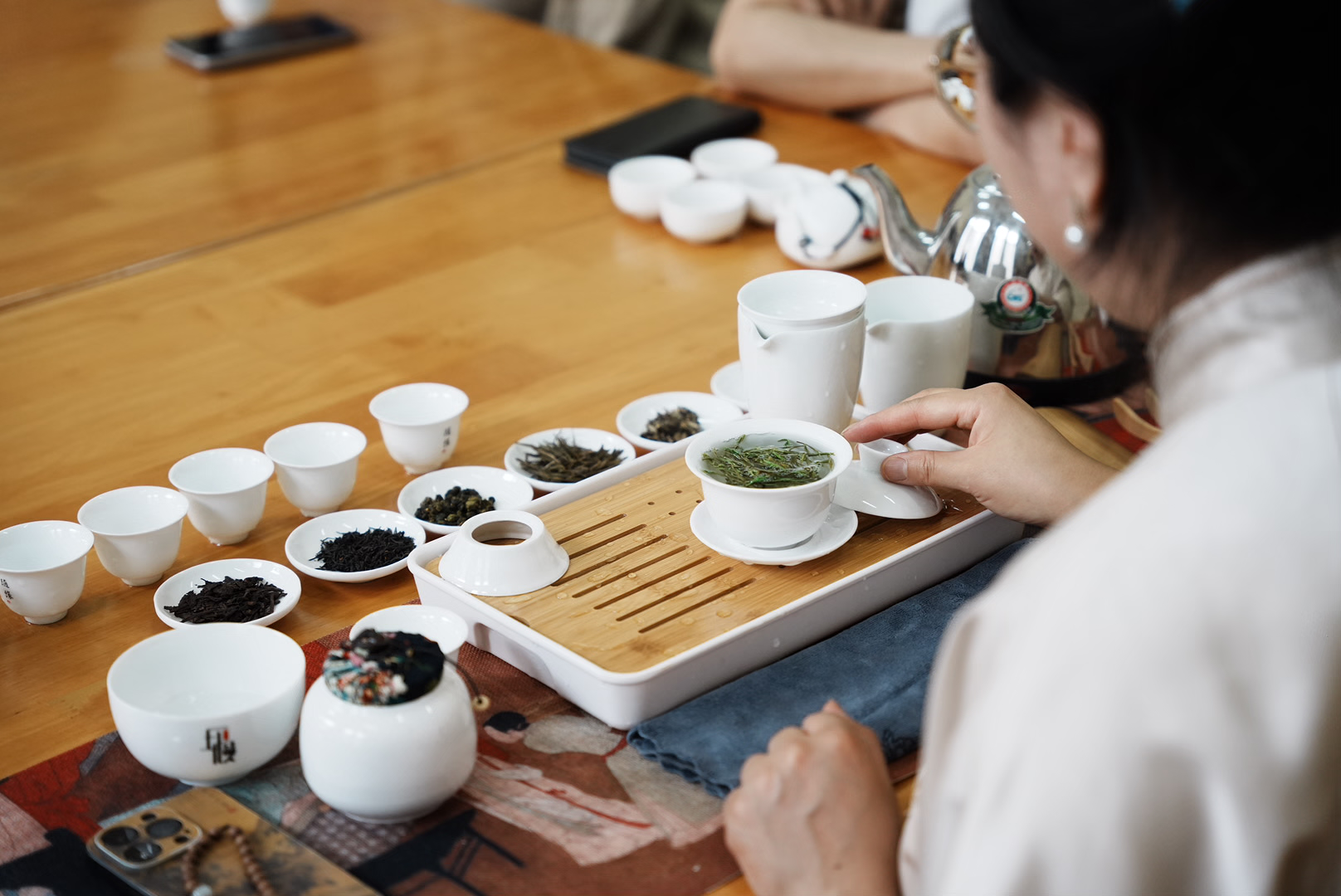 茶艺师从中国茶的六大类开始识茶、认茶,就寻茶源,品茶香,习茶礼三部分进行了讲解和演示,让大家了解了茶的生长环境,采摘技巧,制作过程和文化内涵等方面。