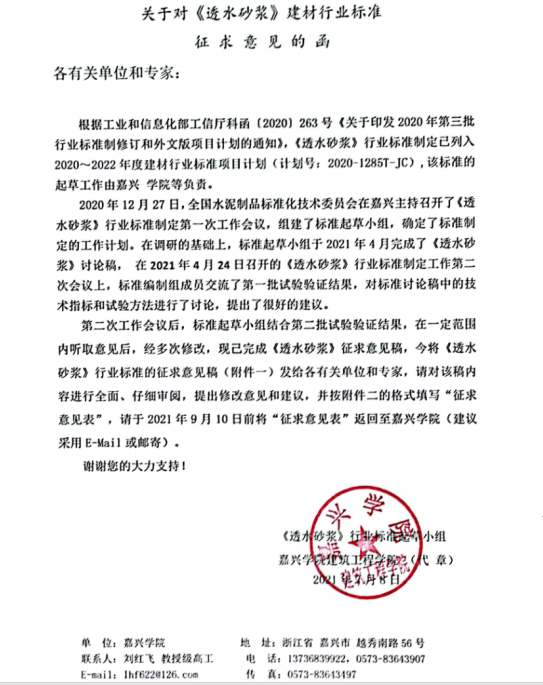 关于对《透水砂浆》行业标准征求意见的函