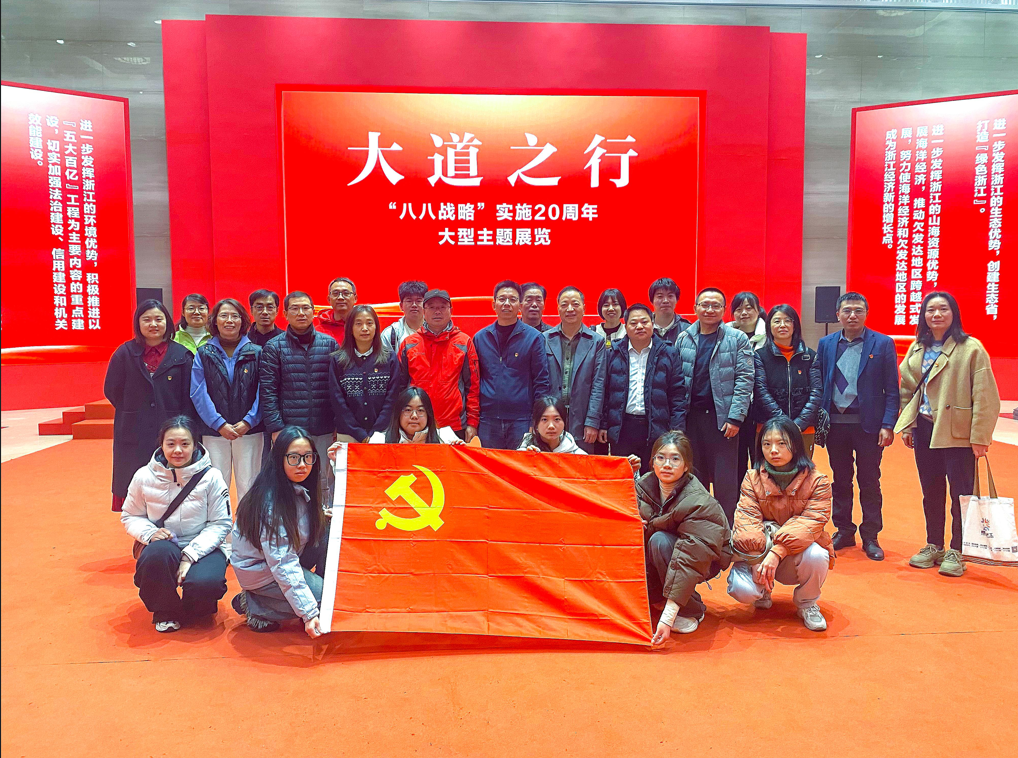 在浙江展览馆,全体人员参观了大道之行——“八八战略”主题展览。“八八战略”是习近平同志给浙江倾情擘画、量身定做的总纲领总遵循,是省域发展的全面规划和顶层设计。展览分为伟大擘画、精彩蝶变、勇立潮头、共谱华章等四个篇章,生动展示习近平新时代中国特色社会主义思想在浙江的实践探索历程,立体呈现在“八八战略”指引下浙江全领域各方面发生的精彩蝶变。大家在参观过程中认真观看,不时驻足交流,进一步了解了“八八战略”在浙江的提出、实施及其重大意义,在“循迹溯源”中现场感受习近平总书记给浙江留下的宝贵思想财富、精神财富和实践成果。大家纷纷表示,要在今后的学习工作中进一步把“八八战略”与学思践悟习近平新时代中国特色社会主义思想贯通起来,以更加昂扬的精神状态、更加扎实的工作作风、更加有力的工作举措推进学院各项工作高质量发展。