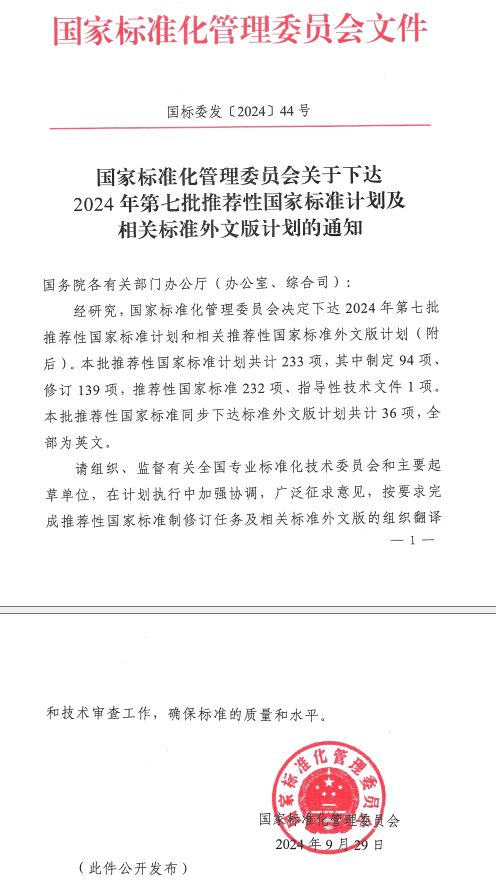 近日,国家标准化管理委员会[2024]44号“关于下达2024年第七批推荐性国家标准计划及相关标准外文版计划的通知”,其中由黄色网