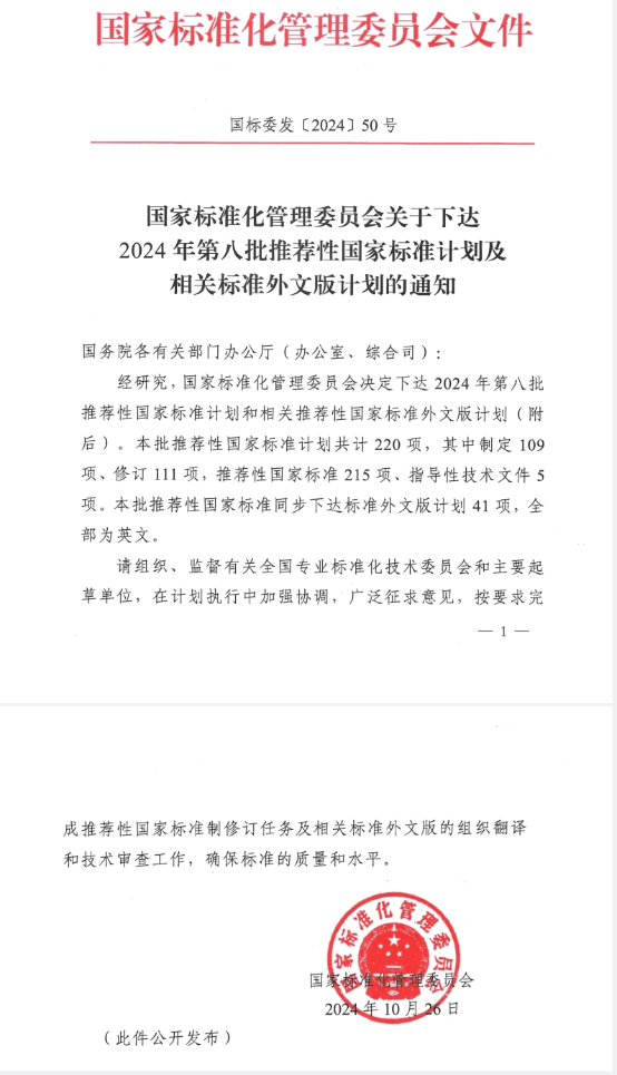 日前,国家标准化管理委员会[2024]50号发出“关于下达2024年第八批推荐性国家标准计划及相关标准外文版计划的通知”,其中由黄色网