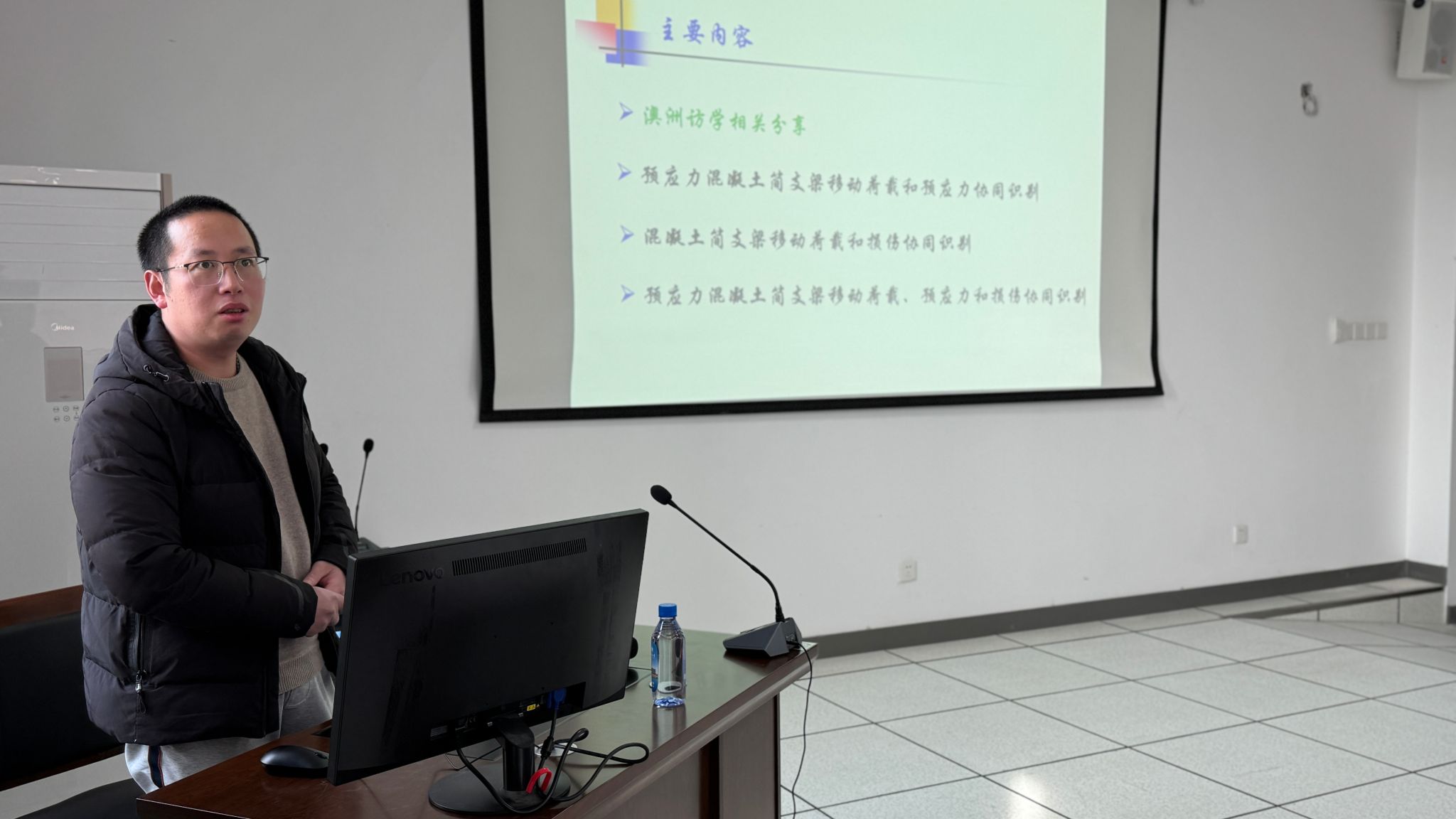 周振纲博士介绍了其在澳洲访学研究中对基于虚拟变形法VDM和荷载形函数LSF法的预应力混凝土简支梁桥移动荷载、预应力和损伤协同识别的理论和数值模拟研究工作的成果及澳洲访学经历分享,在报告中和报告结束后与土木系教师进行了相关问题的交流和探讨。
