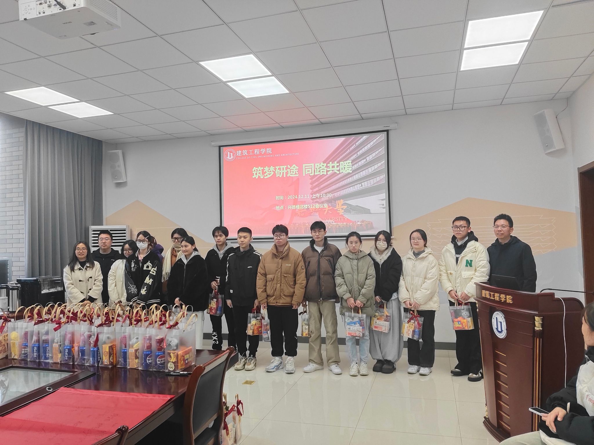 在兴德楼北楼512会议室为2025届考研学子举办“筑梦研途,同路共暖”考研慰问活动。学院党委书记童勇军、党委副书记杨智慧、党委委员武小鹏、辅导员庄峰参与本次活动。